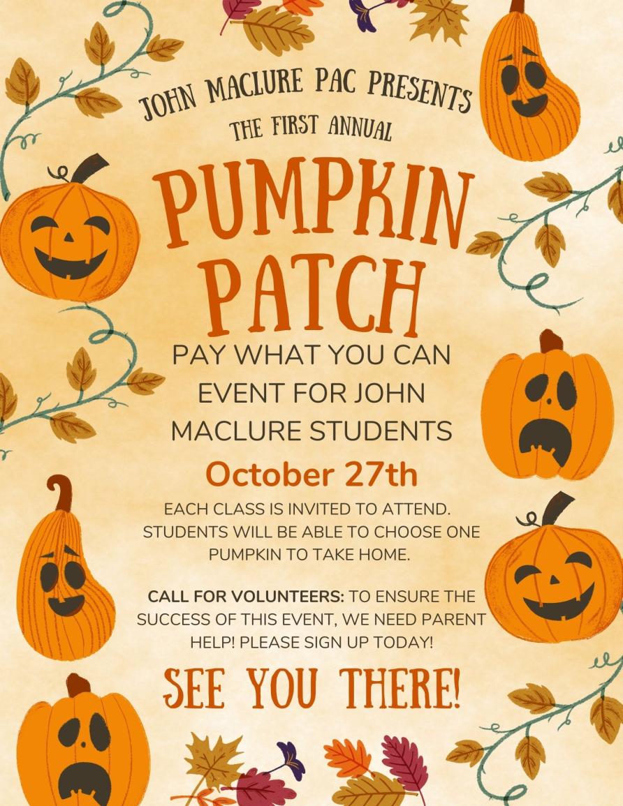 The John Maclure PAC is organizing a Pumpkin Patch for our students! It is a pay what you can event where students will be able to choose a pumpkin to take home with them.
